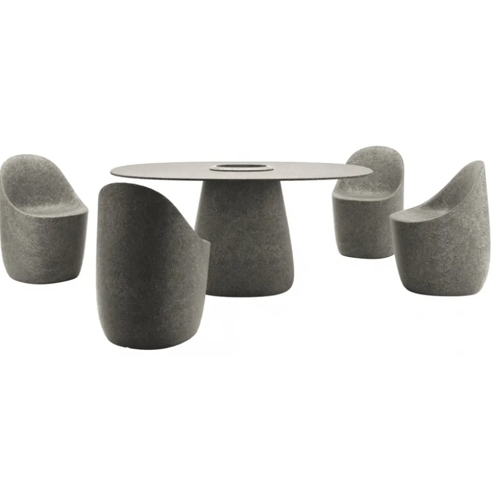 The Cobble Table designed by Elisa Giovannoni is characterised by a central base where you can insert a bucket containing plants or ice to keep bottles fresh. The Cobble seat is a comfortable chair provided in the same colors of the table base, produced in recyclable polyethylene.