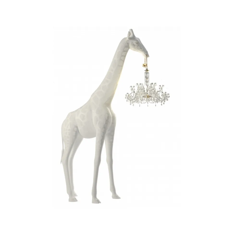 “Giraffe in Love” is the new product born from the collaboration between artist/designer Marcantonio and Qeeboo. It is a dreamy giraffe holding a classic Marie-Thérèse style chandelier. “Giraffe in Love” represents irony and lightness: the giraffe is in love but she does not know it yet because her heart is far from her head and she lives love light-heartedly.