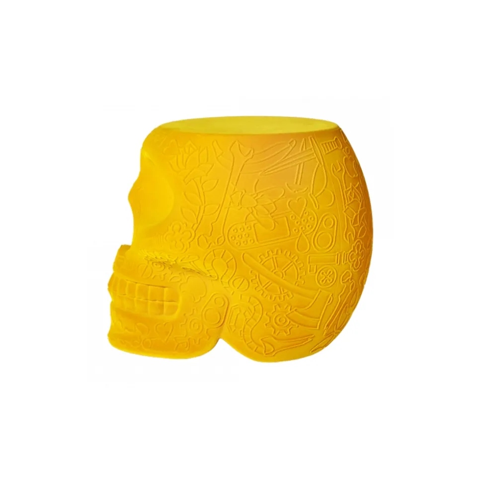 Decorated with the graphic pattern of the Mexican skull, a symbol created to exorcise death and celebrate life, it becomes an extravagant stool/table with a rigid top.