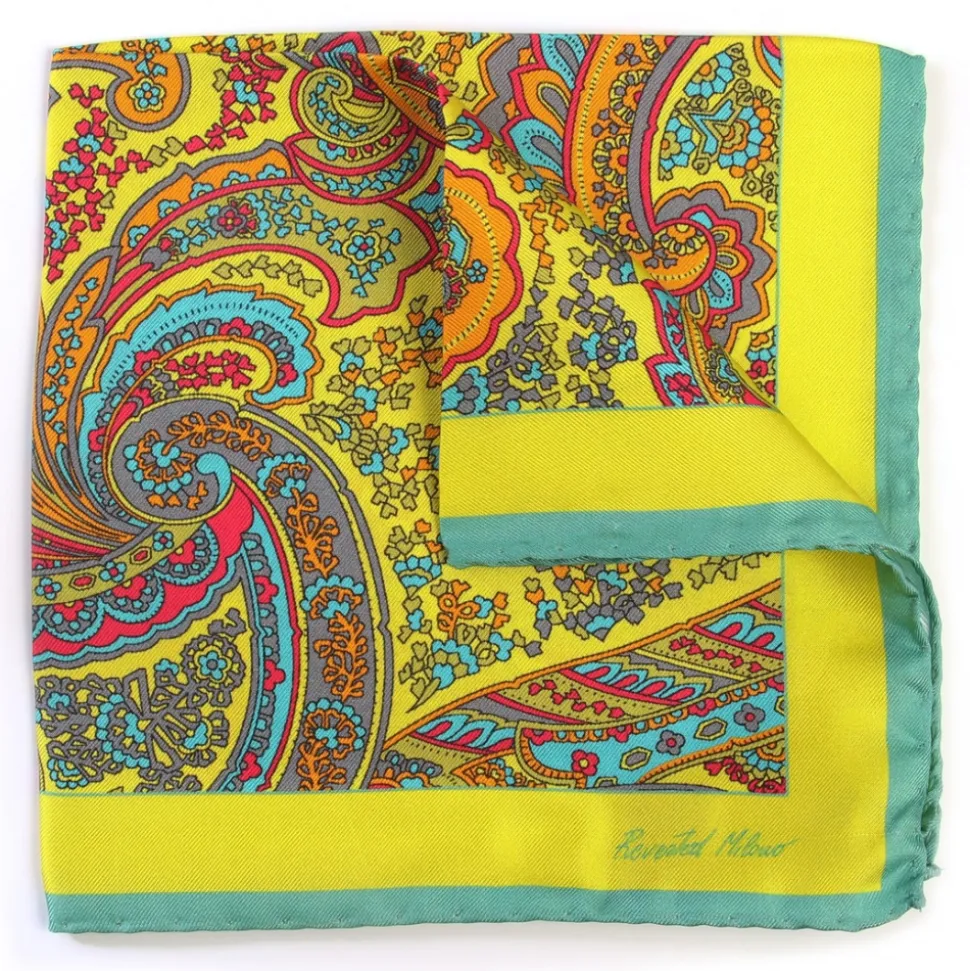 This Vibrant silk pocket square is made in Como using the best silk quality with a finish that gives a unique softness and bold colors. The patterns have been designed starting from the old archives after studying a modern color palette.