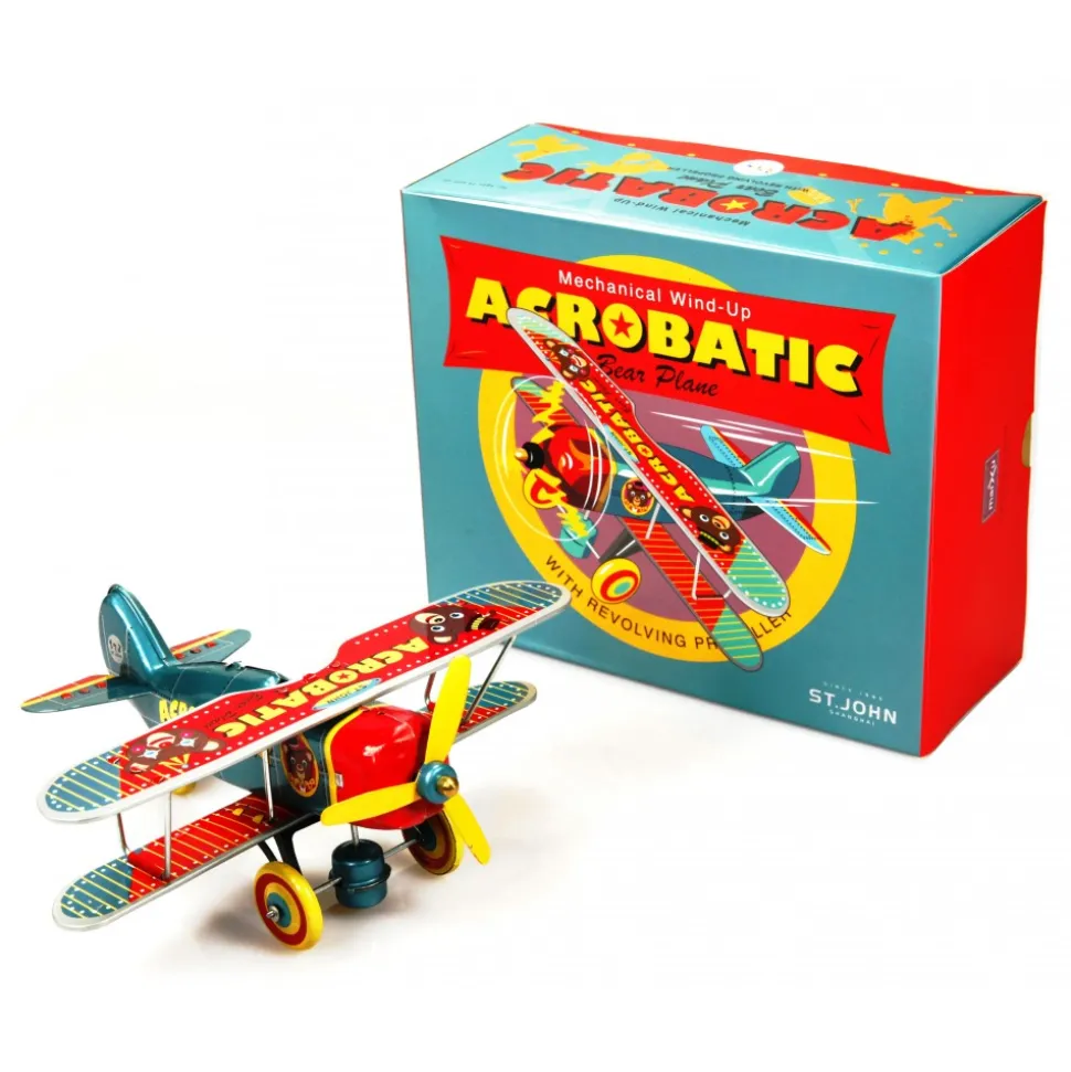 Saint John – Acrobatic Bear Plane Aeroplano Acrobatico Orso – Collectible Retro Wind Up Tin Toy – Metallic Blue Red – Tin Toys