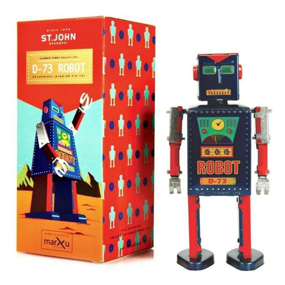 Unique, high-quality mechanical collectable Saint John made in the same way as the popular 1930s-1960s tin toys. D-73 Robot Tin Toy.