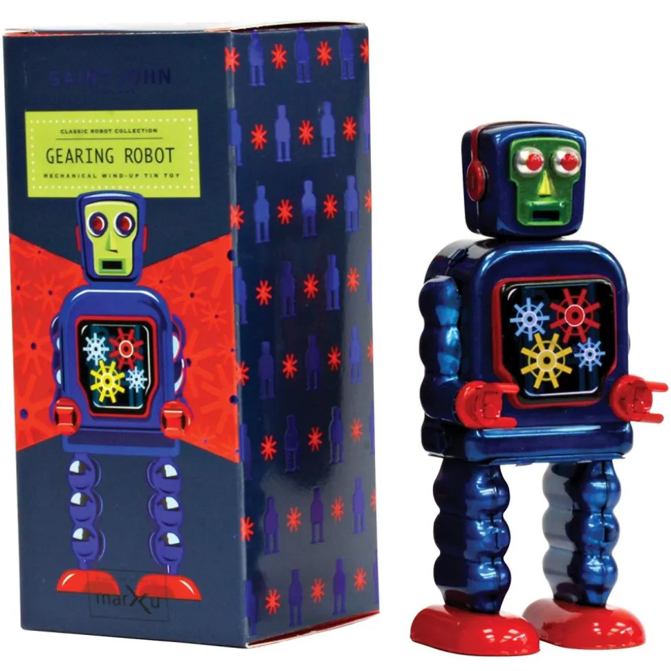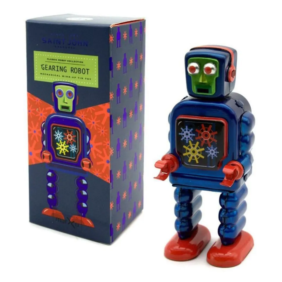 Saint John – Gearing Robot – Collectible Retro Wind Up Tin Toy – Red and Blue – Tin Toys