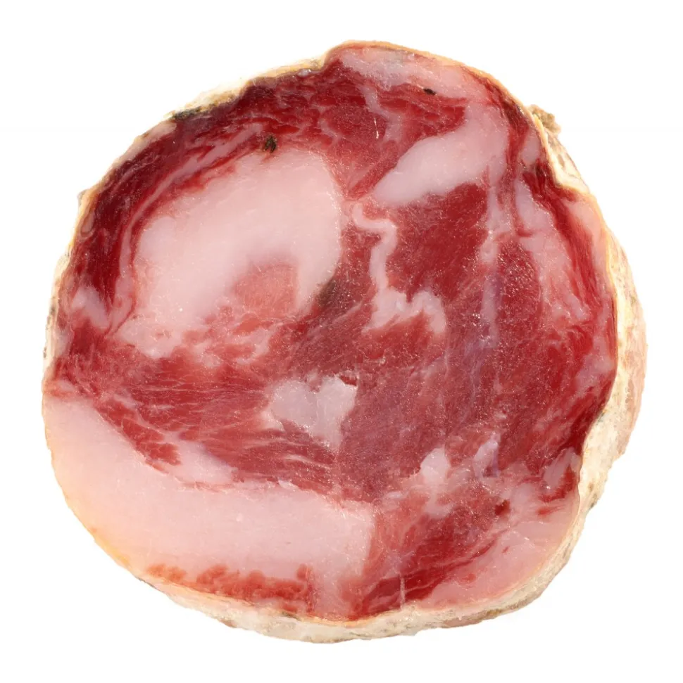 The key characteristic of this product is its grain, indeed the meat is hand-cut with the tip of the knife. This type of process makes it a very particular salami and it is produced in limited quantity.
