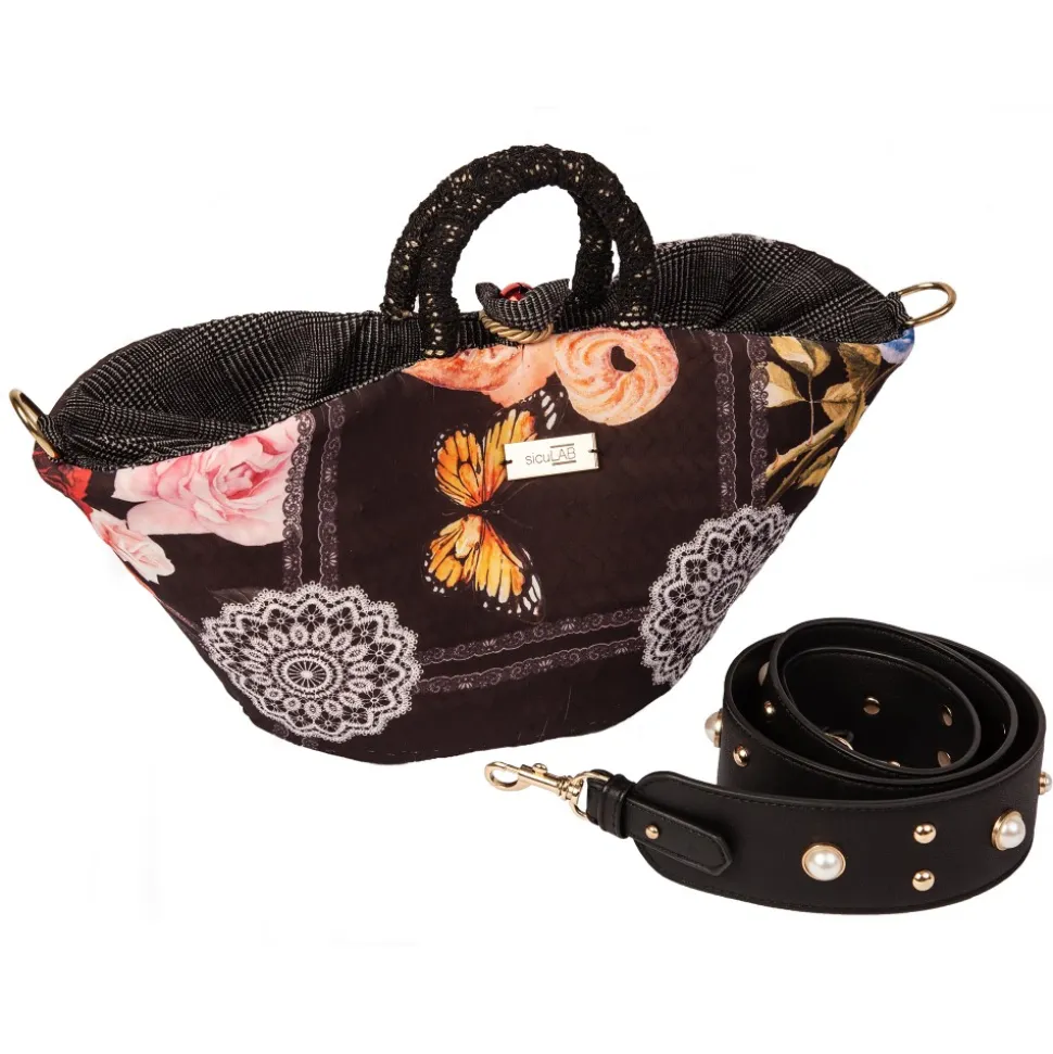 Silk fabric with vegetables, butterflies and doilies, shoulder strap in faux leather and pearls closure with “Prince of Wales” fabric.
