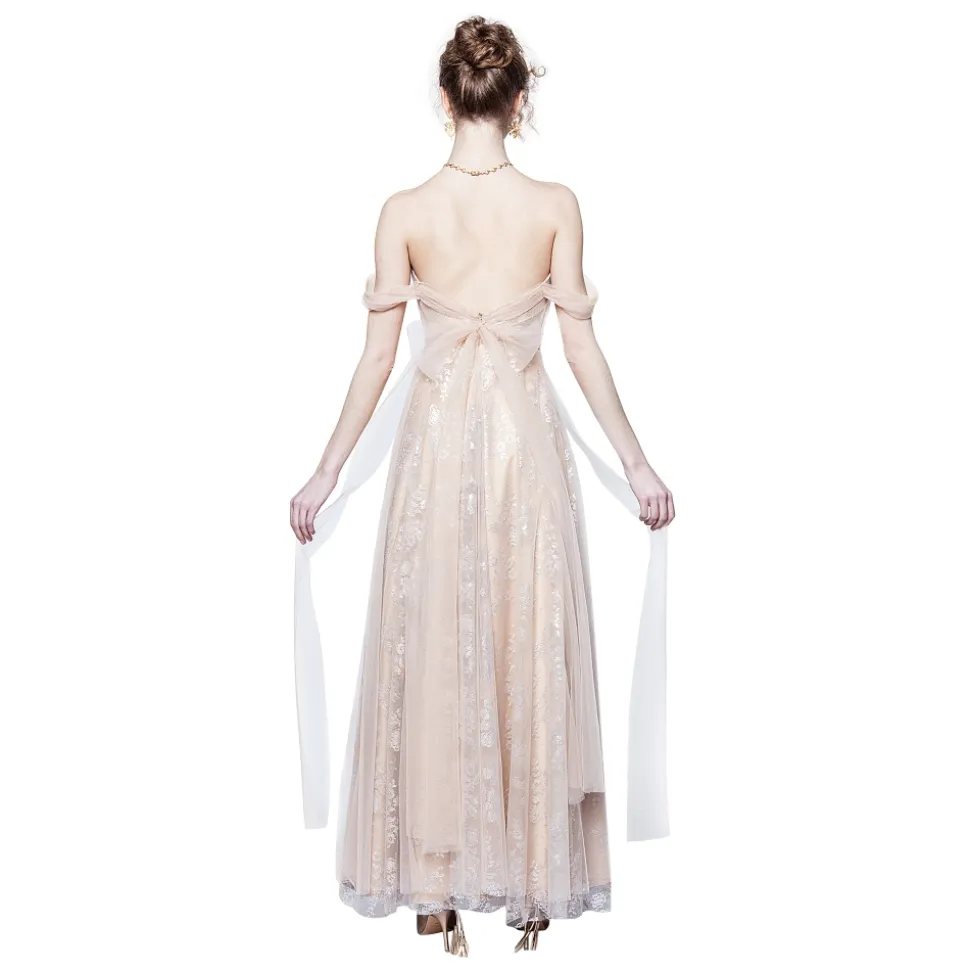 Tulle and light lace lamè effect give life to the main structure of the dress with the sweetheart neckline, decorated with a moulage-made drape, all exclusively hand made. Tulle bands fluctuate from the corsage to the skirt, topped by the light bow that adorns the back of the waistline.