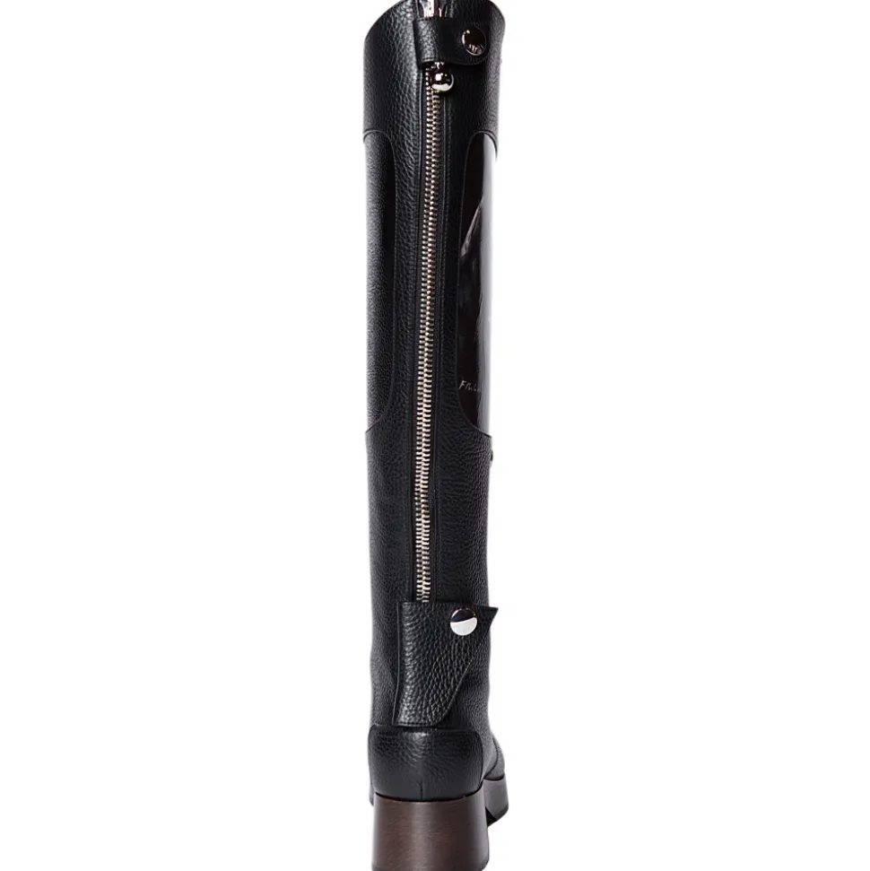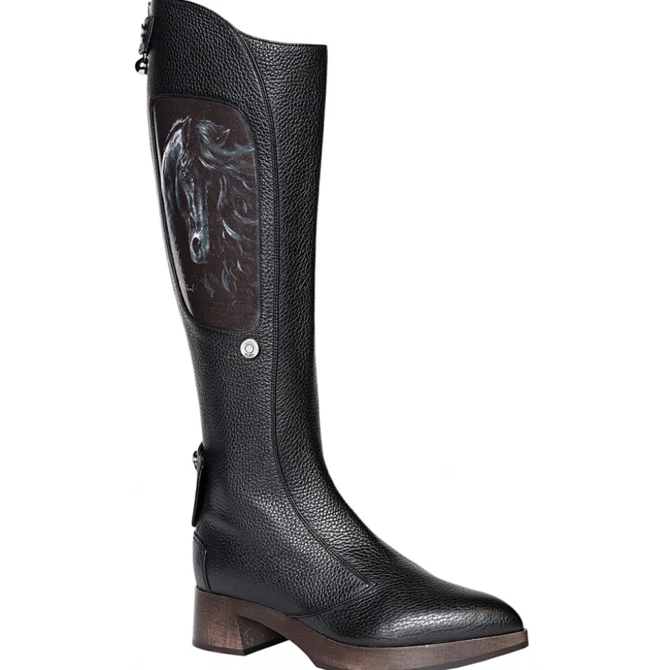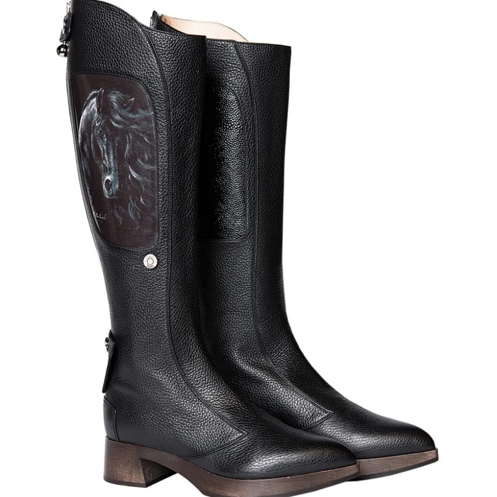 High boots in black sof bovine leather with black horse art prineng (F. Morlacchi’s art) and imitaeon of cramp-fish inserts, anebacterial silver lining colore nude, beech-wooden dark brown waxed sole with heel high 30 mm. Made in Italy.