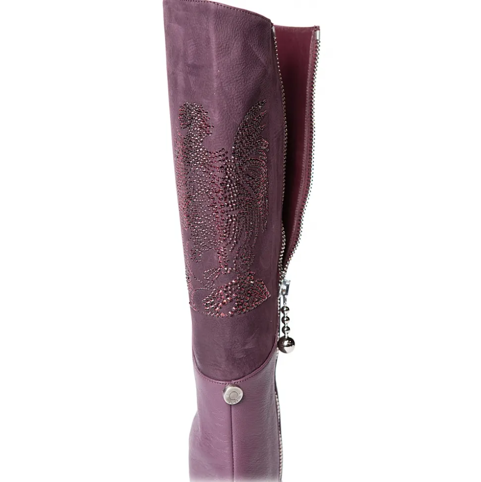 High boots made of burgundy sof bovine leather, lining is in bordeaux calf leather, the bootleg is with bordo rhinestone Gallo (rooster) on nabuk leather, beech-wooden dark brown waxed sole with heel high 30 mm. Made in Italy.