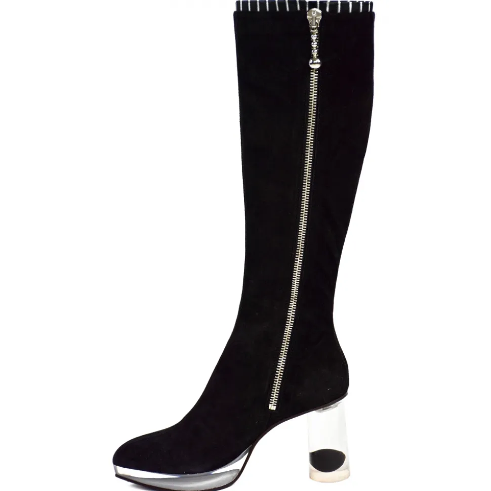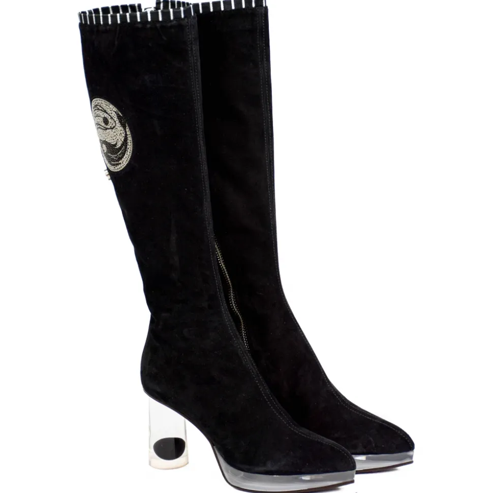 Black suede boots with Yin&Yang moeve printed on white strass of the boot-legs, lining in black and greystriped satin, lateral metal zip with spherical zippuller, plateau and heels are of transparent plexi, 70 mm heels are with englobed black spheres, soles are in brown leather. Made in Italy.