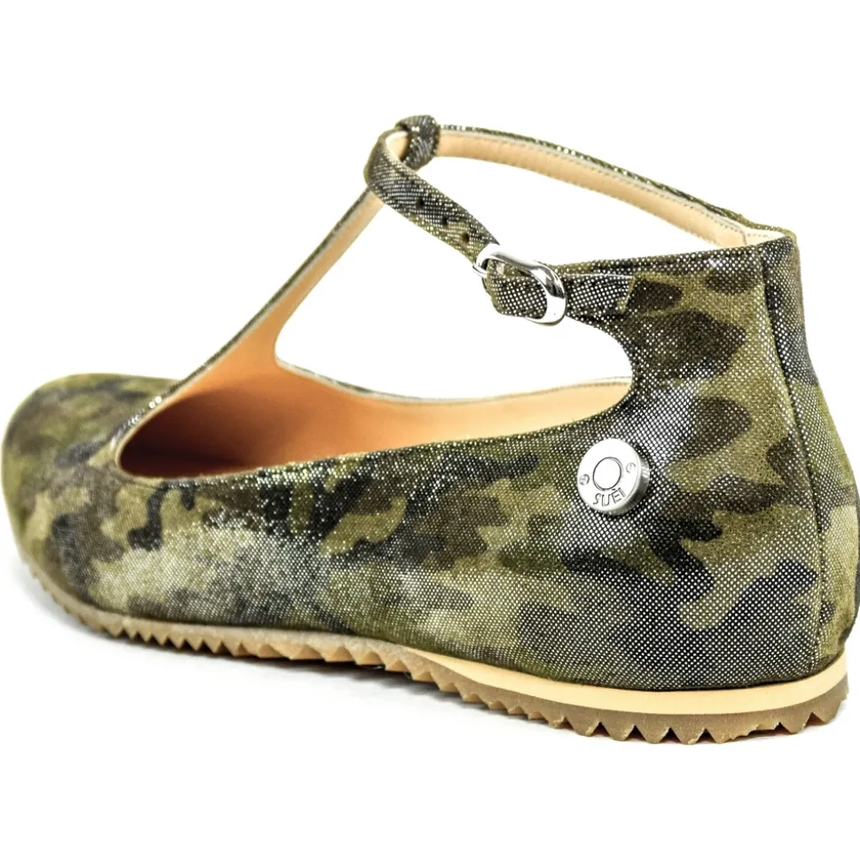 Flat t-bar pump made of militari she-goat leather, leather lining col Beige, rubber sole of battistrada style col Amber. Made in Italy.
