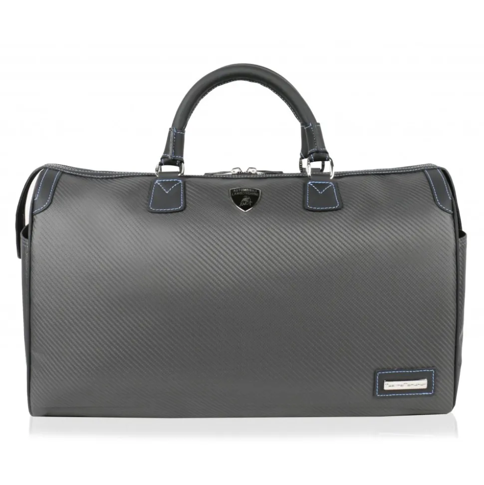 TecknoMonster and Automobili Lamborghini co-branding Ultralight Boston Bag in Carbon Fibre Nix. Car leather is used for handle and details which come in black colour with blue stitchings.