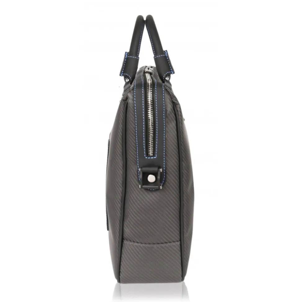 TecknoMonster and Automobili Lamborghini co-branding ultralight business bag in Nix Carbon Fibre. Car leather is used for handle and details which come in black colour with blue stitchings.