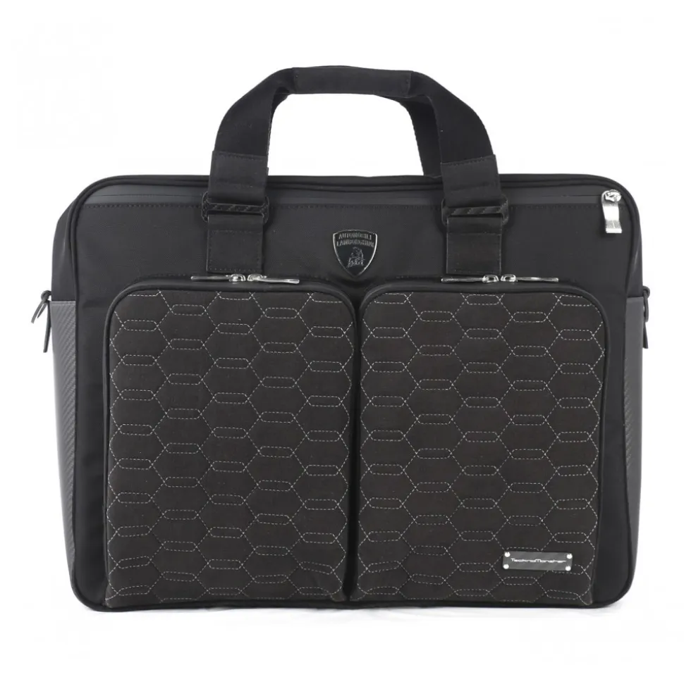 The Surcloud Automobili Lamborghini briefcase bag originates from an exclusively Italian collaboration between the Casa del Toro and TecknoMonster. Handcrafted in Italy, the special edition Black Carpet is created using the same materials used in the super sports cars Lamborghini, soft carbon and Alcantara®, combined with a practical technical nylon. The hexagonal quilting of Alcantara® makes this iconic object. The shoulder strap is adjustable and removable.