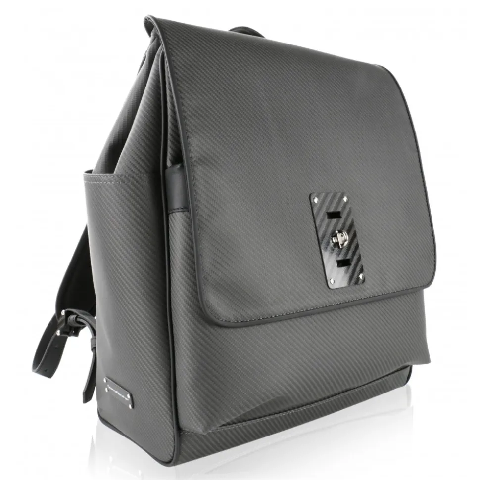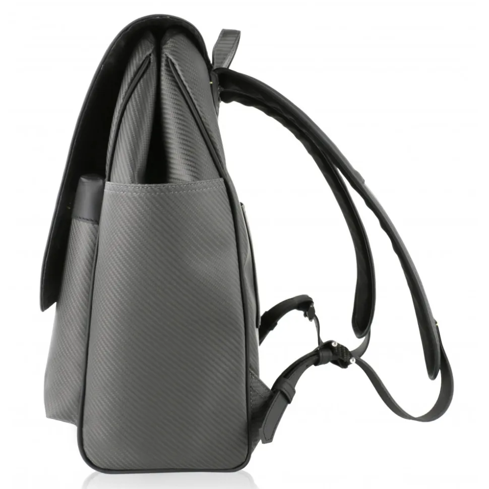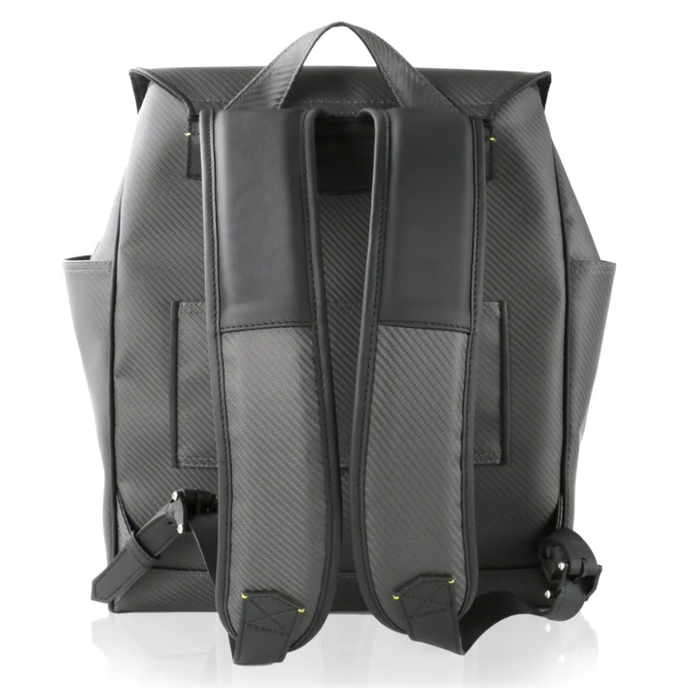 Ultralight Backpack in Carbon Fibre Nix with handle and hand made leather details. Plate logo with Carbon Fibre Glacies.