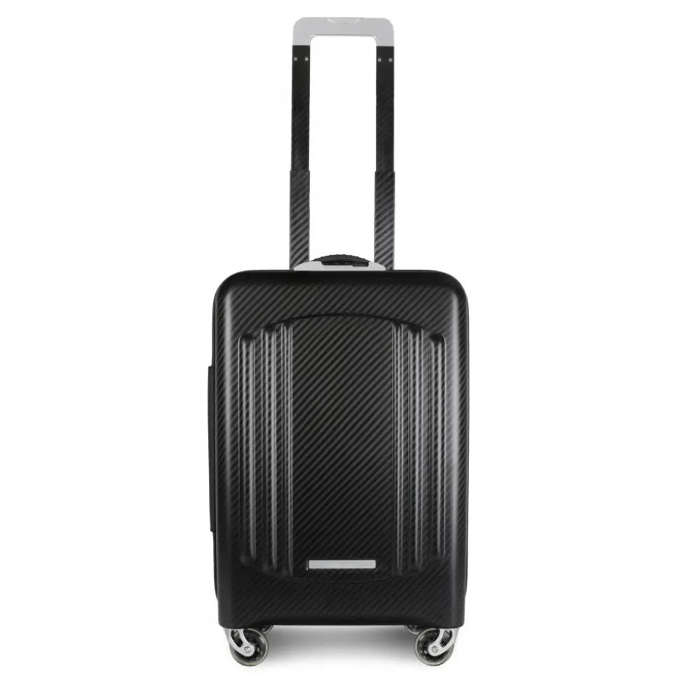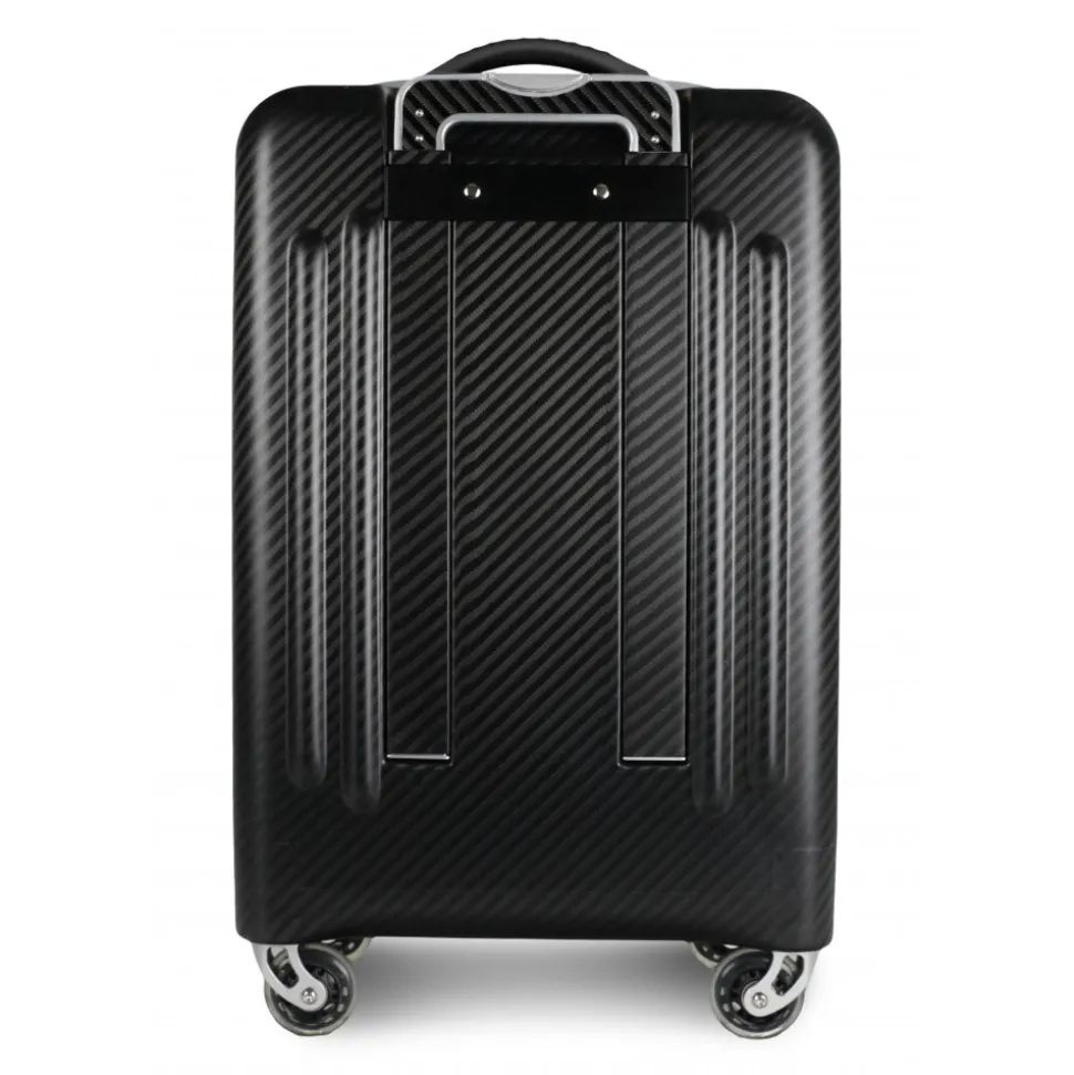 Carbon Fibre Trolley Glacies, forged in autoclave with zipper on top and aluminium details and two leather strap buckles.