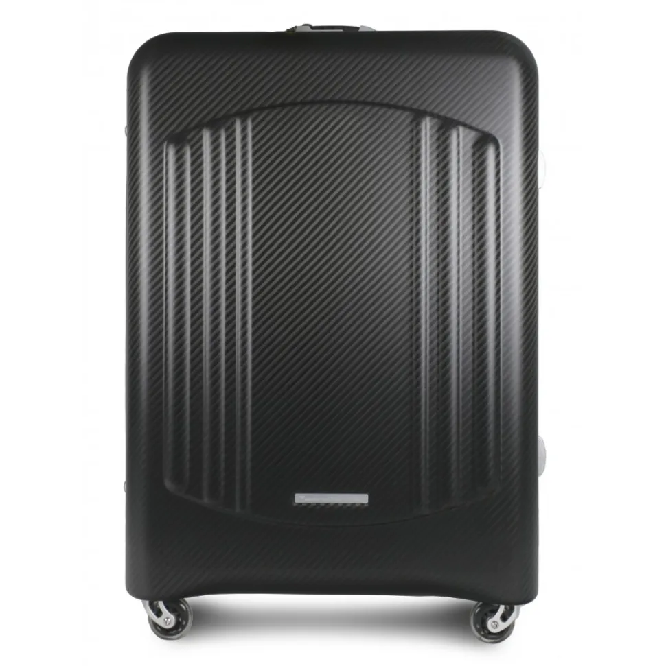 Carbon Fibre Trolley Glacies, forged in autoclave with zipper on top and aluminium details and two leather strap buckles.