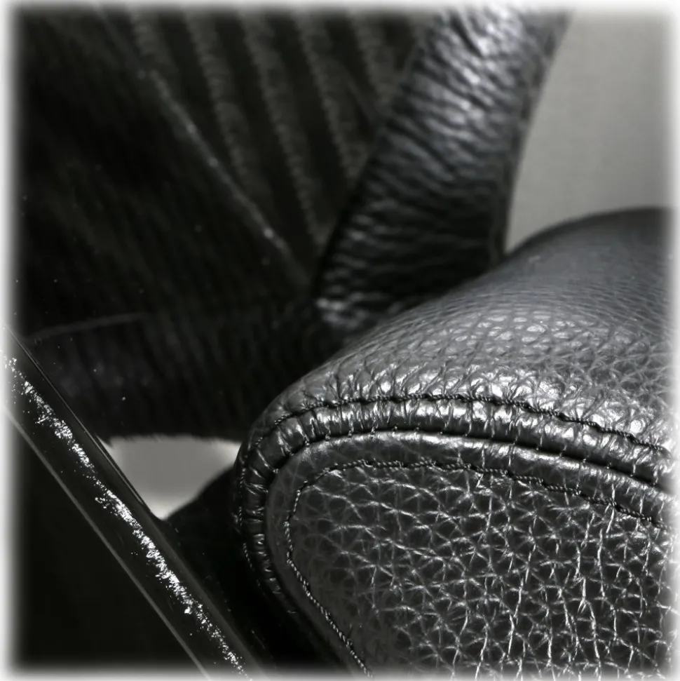 Framed armchair in Carbon Fibre Lucid Glacies and black leather pillows.
