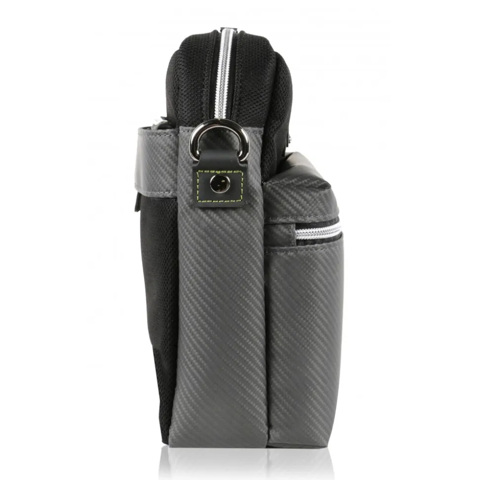 TecknoMonster and Lamborghini Squadra Corse co-branding shoulder bag made of Carbon Fibre Nix and Black Technical Fabric. The leather used for the finishings is the same for cars whilst the seams are green. The logo is printed on Carbon Fibre Glacies.