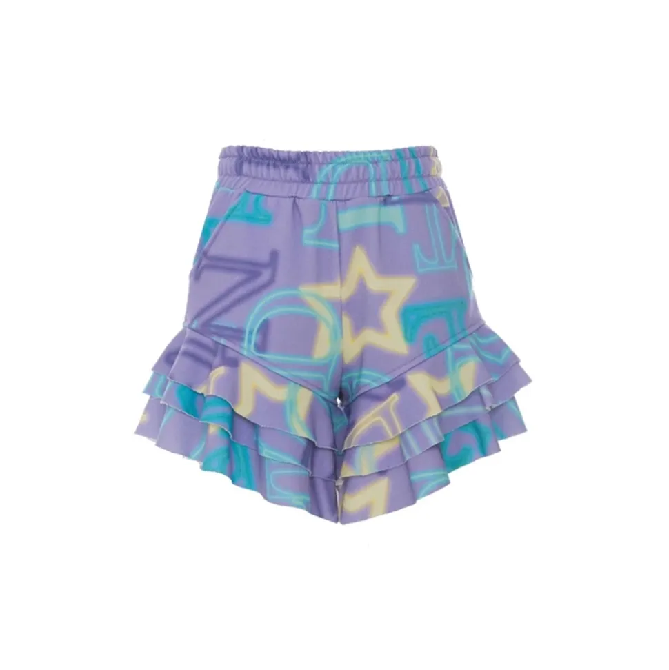 Printed fleece shorts with raw cut ruffles. Elastic and culisse at the waist.