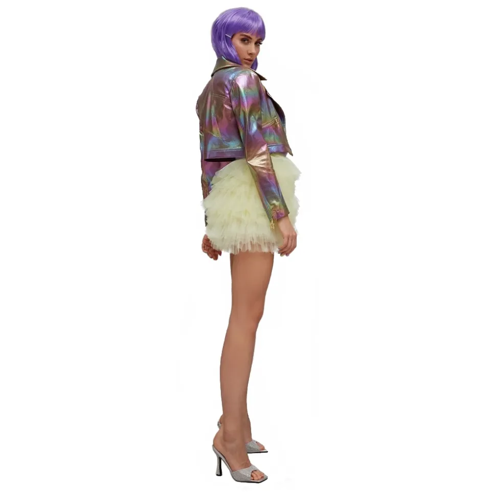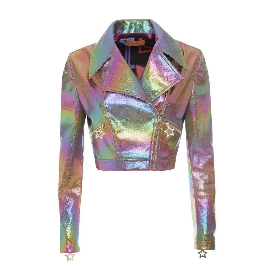 Cropped jacket in metallic eco-leather and star carved on the back. Closure with automatic.