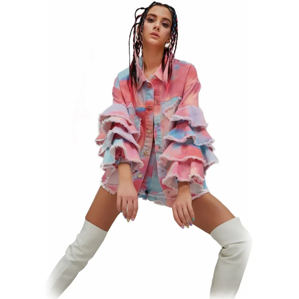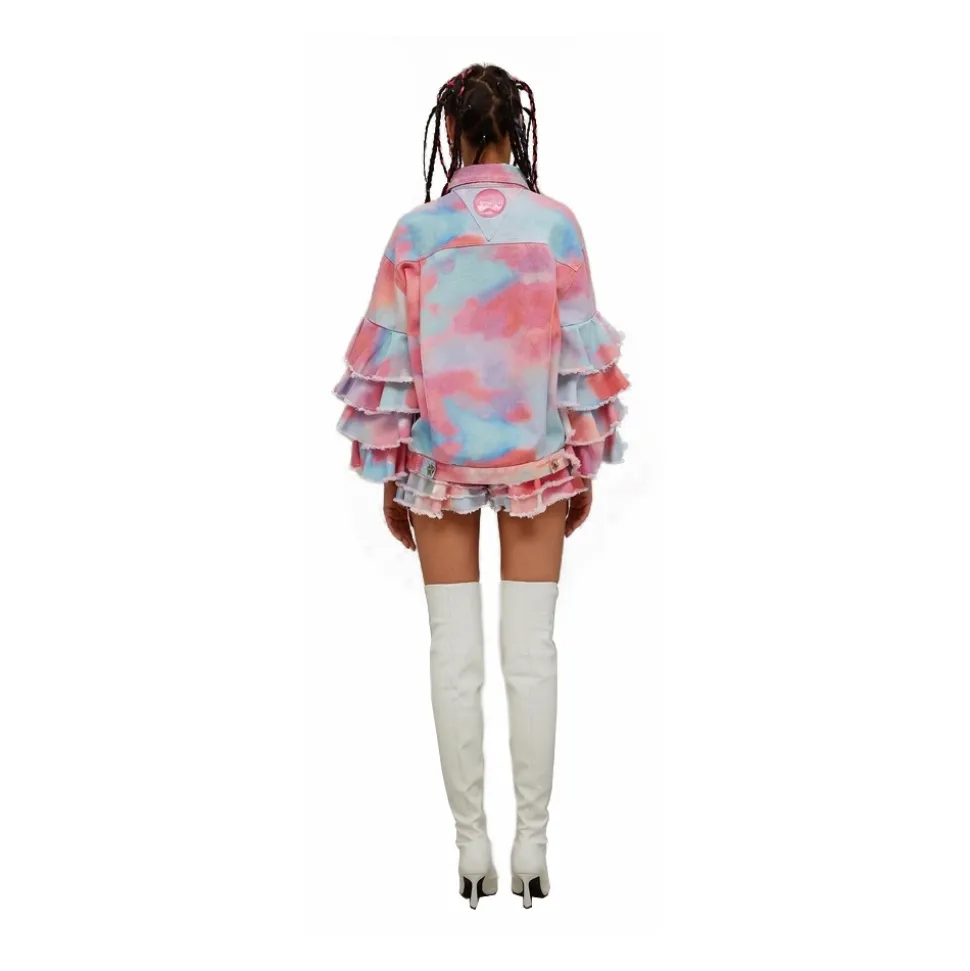 All-over printed denim jacket and raw cut ruffles on the sleeves.