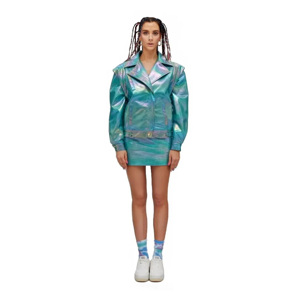 Oversized jacket in metallic eco-leather and star carved on the back. Padded and removable shoulder straps. Closure with automatic.