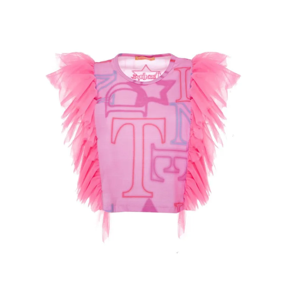 Cropped t-shirt in printed jersey with tulle on the sleeves in contrasting color.