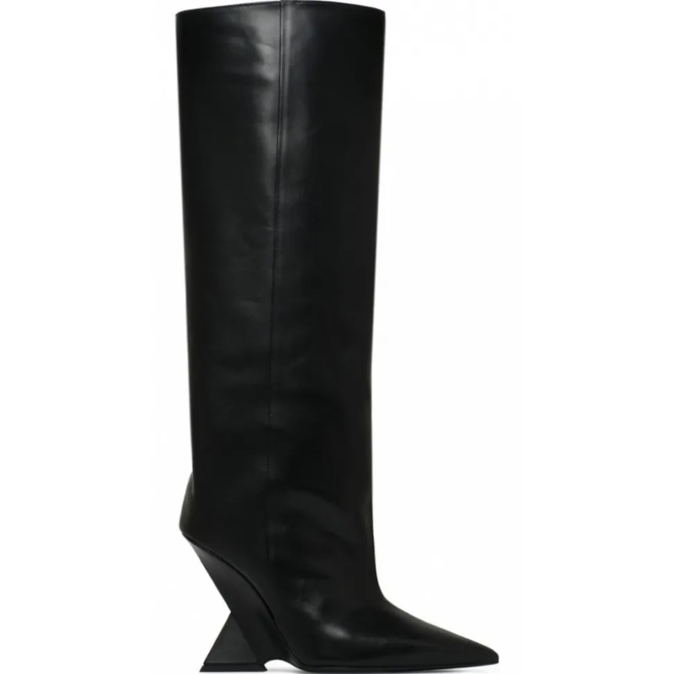 The Attico Cheope Tube Boot. Black calfskin tube boot with 105mm high pyramid wedge.