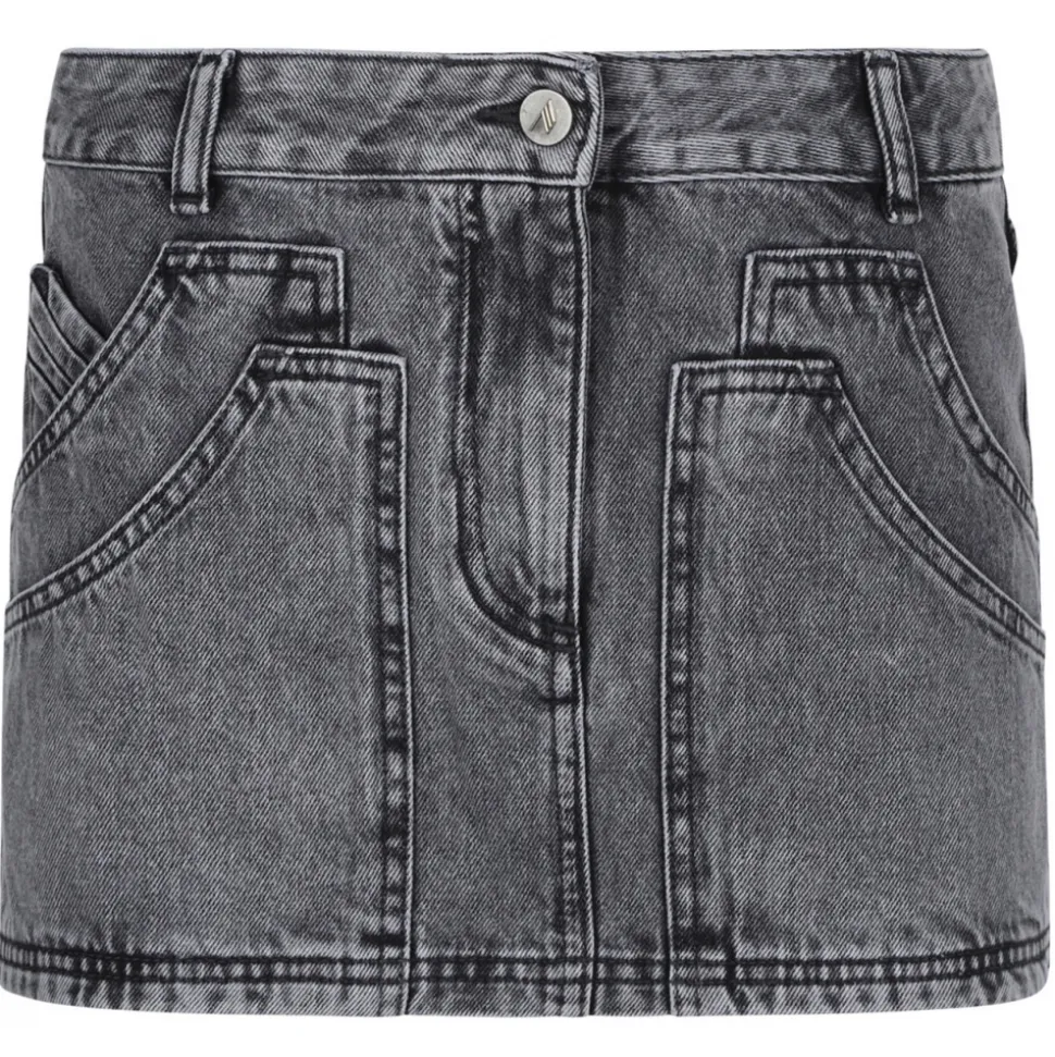 The Attico Black Denim Mini Skirt. Black cotton mini skirt, front button and zip fastening. Belt loops, multiple patch pockets, embroidered logo to the rear.