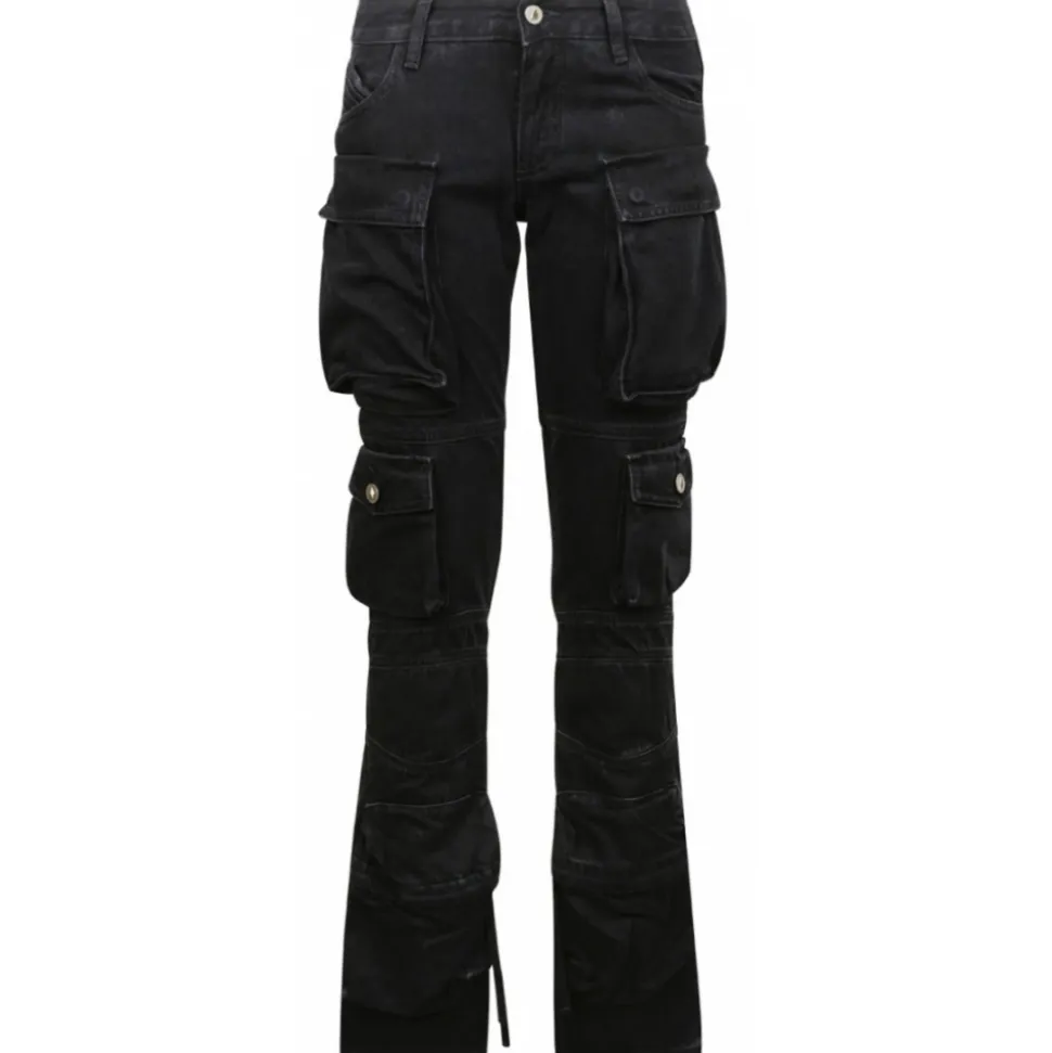 The Attico Essie Long Trousers. Black skinny multi-pocket long trousers in denim with low waist and fifth pleated pocket.