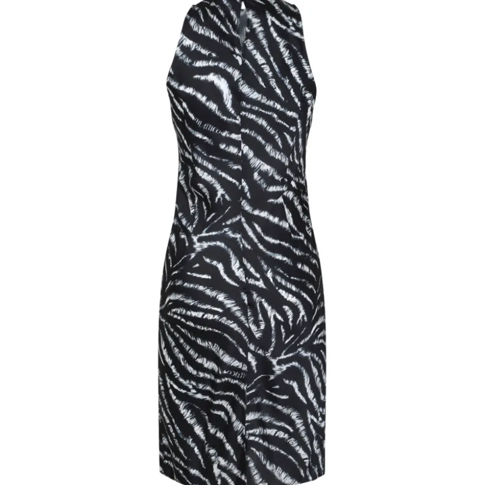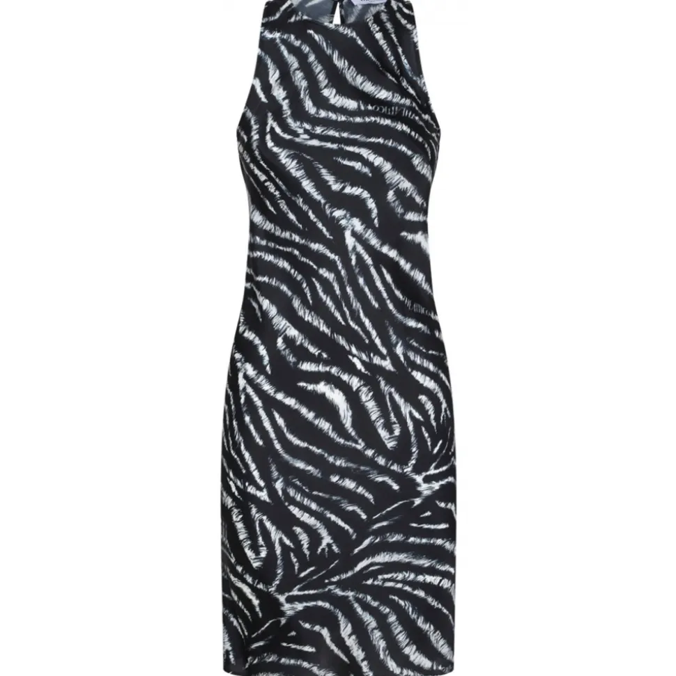 The Attico Black Zebra Print Mini Dress. Black mini dress, zebra print, single rear button fastening, round neck, sleeveless, straight hem.