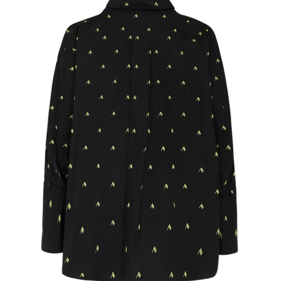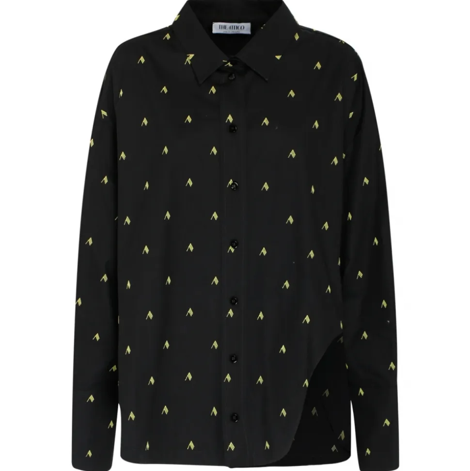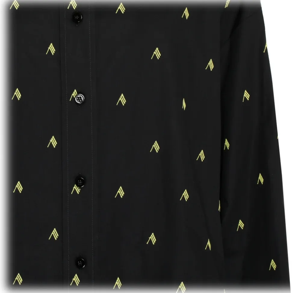 The Attico Black and Yellow Cotton Diana Logo Print Shirt. Black and yellow cotton shirt, all over logo print, oversized silhouette, asymmetric hem. Classic collar, front button fastening, buttons cuffs.