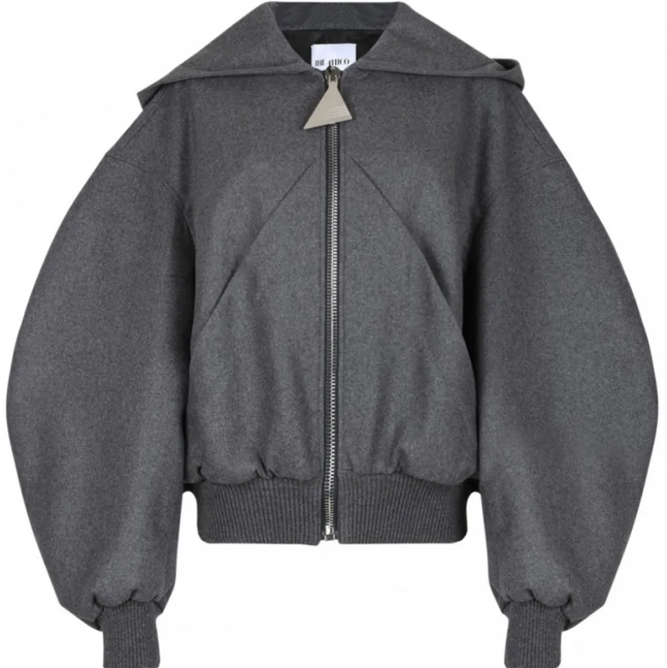 The Attico Grey Bomber Jacket. Grey wool blend bomber jacket, melange eggect, slouchy hood, front zip fastening. Branded zip puller, drop shoulder, long sleeves, ribbed cuffs. Two diagonal pockets to the sides, full lining, ribbed hem.
