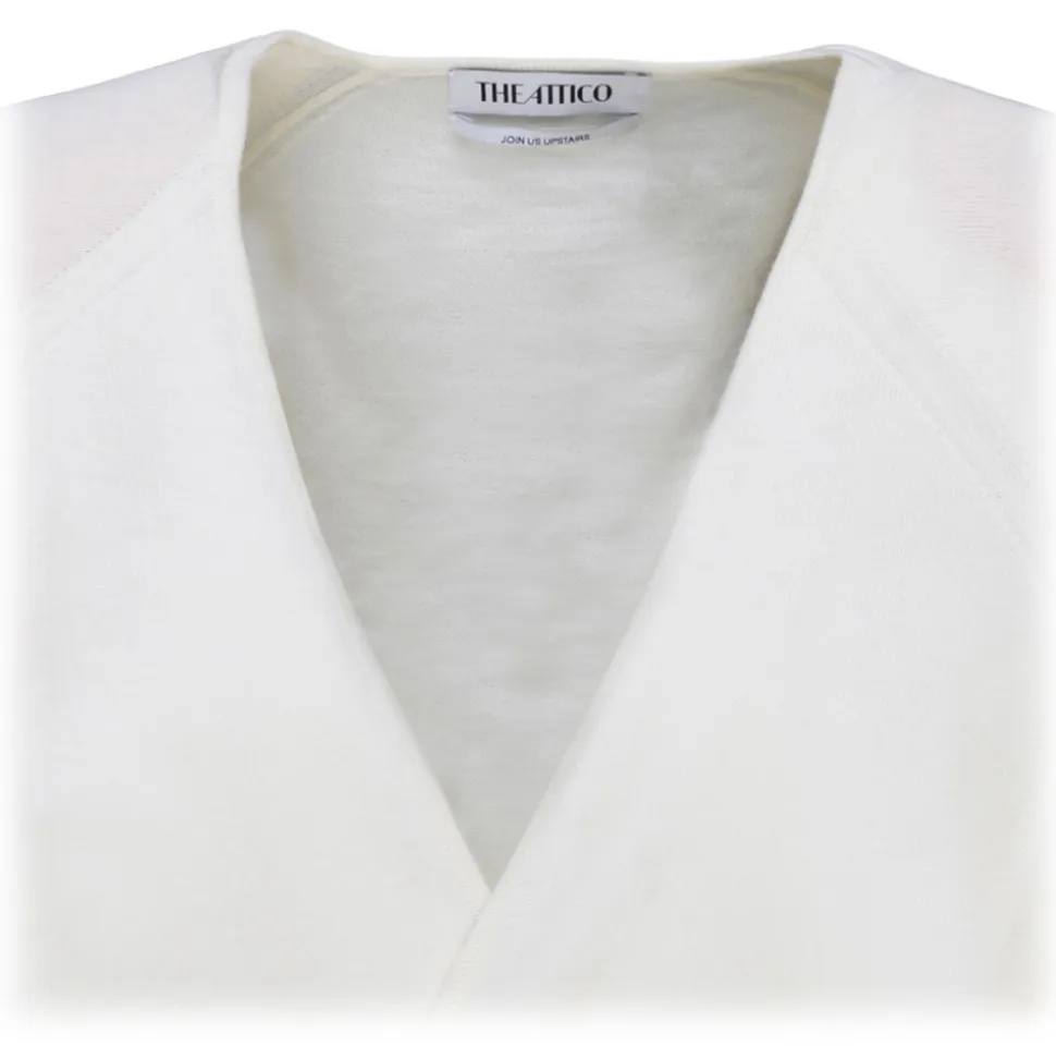 The Attico Ivory Wool Hurley Wrap Mini Dress. Ivory wool mini dress, wrap design, ring hardware detailing, V neck, long sleeves, buttoned cuffs, draped design and asymmetric hem.