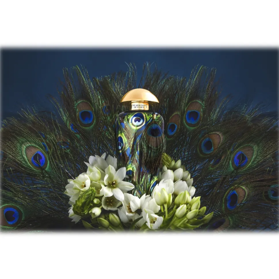 Emerald-coloured eyes, the whoosh of a regal garment and the unmistakable scent of timeless elegance: Imperial Emerald is the seductive fragrance by The Merchant of Venice and takes its inspiration from the peacock, the most enchanting and majestic of creatures. For millennia this bird has inspired myths and legends in both western and eastern cultures, legends that attributed to it the most sublime meanings: beauty, longevity and love, along with vanity, luxury and pride. The dazzling, visual displays generated by its fan-like tail have enchanted and confused the gaze of mortals, as well as the immortals of countless myths. To pay homage to the elegance and wonder of Venice, The Merchant of Venice was inspired by these emerald-green and blue patterns and created this olfactory masterpiece.