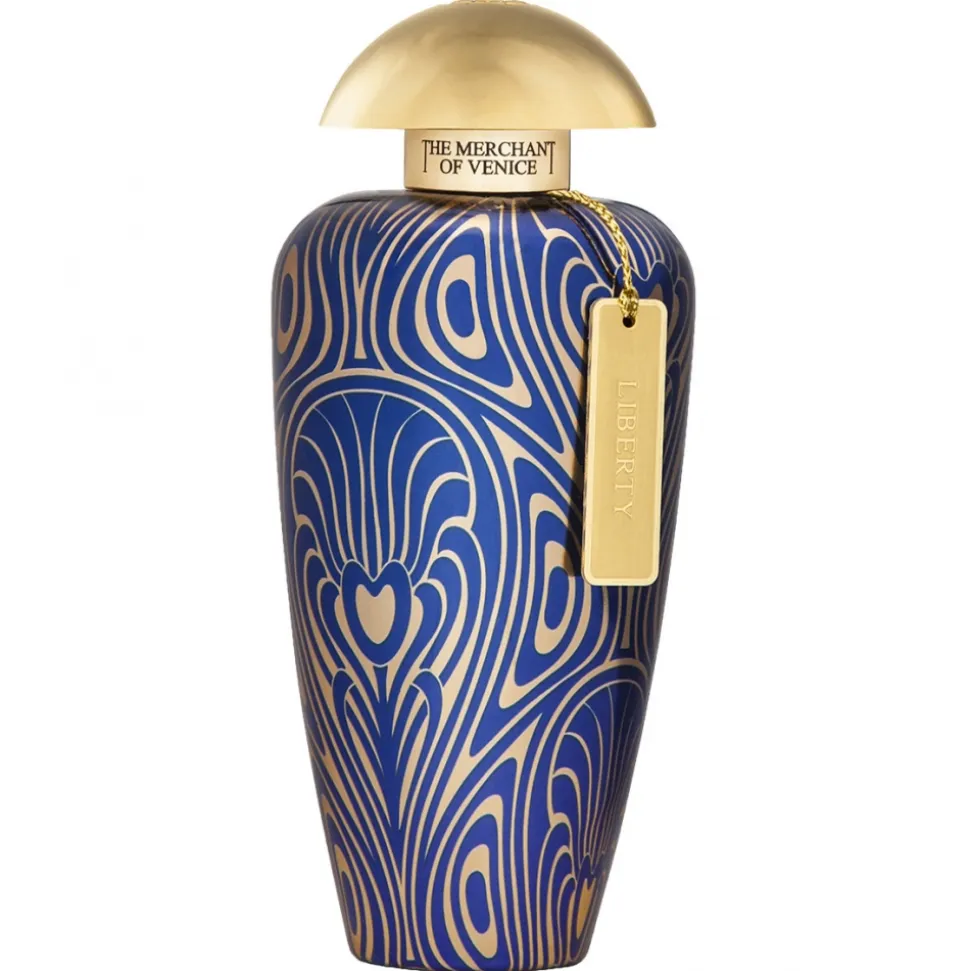 The perfume Liberty is enclosed in an elegant flacon made in typical venetian blue and gold colours. It reinterpretes the most classic shape of Murano glass design showing a particular motive. It is not unusual to find beautiful upholstery fabrics, made in precious materials and printed with vibrant deep colours. This unusual flacon gets inspiration from this fabrics and transmits a dreaminess impression with a light design that flows all over its surface. It is further embellished with a golden cup that shows the wind rose and a golden metal label showing the name of the fragrance, that hangs from the neck.