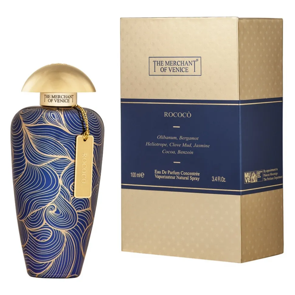 The perfume Rococo’ is confined in a sophisticated flacon made in typical venetian blue and gold colours. It reinterprets the most classic shape of Murano glass design showing a characteristic pattern inspired in the artistic style in interior design, from which Venice is the greatest representative of Italy. The style is reinterpreted with golden lines that create a light airy impression on the surface of the flacon. Delicate and poetic like daydreaming. It is further embellished with a golden cup that shows the wind rose and a golden metal label showing the name of the fragrance, that hangs from the neck.