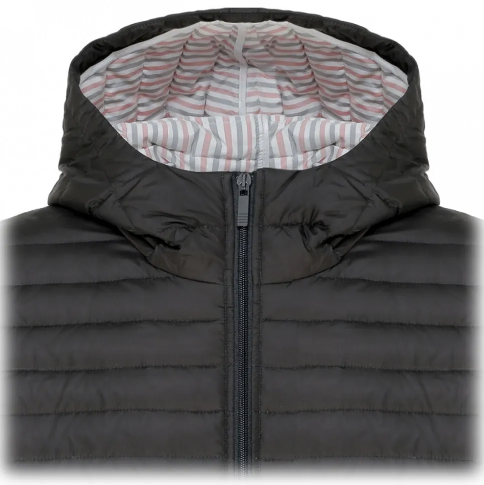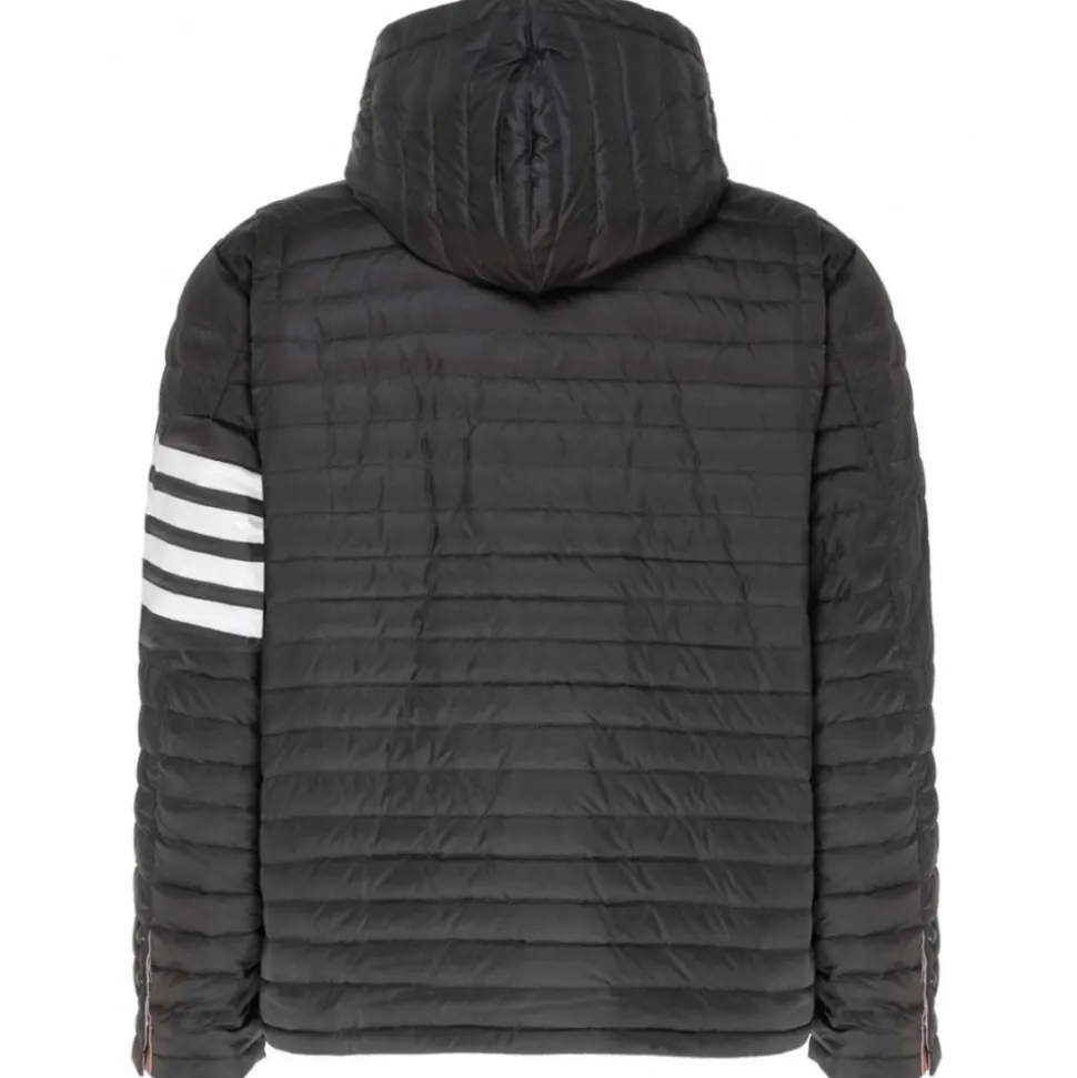 Thom Browne Black Padded Jacket. Black feather down padded jacket, signature 4-Bar stripe draws the eye. Featuring a hood, a front zip fastening, long sleeves, button cuffs, front zipped pockets, front zipped pockets, a printed lining and a 4-Bar stripe.