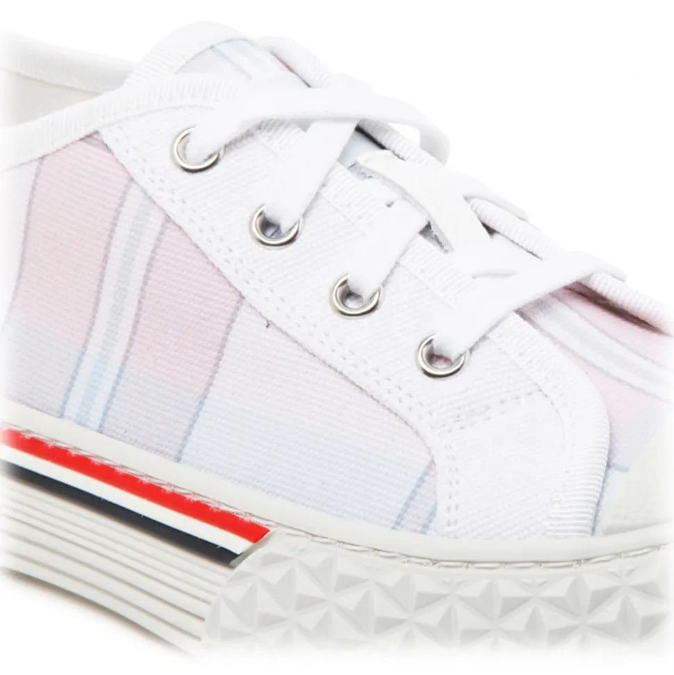 Thom Browne Madras Light Pink Canvas Collegiate Low Top Trainers. Light pink canvas low top trainers, check canvas with tartan textured, white front lace up fastening, logo flag at the tongue. Rubber cap toe, signature striped grosgrain loop tab at heel.