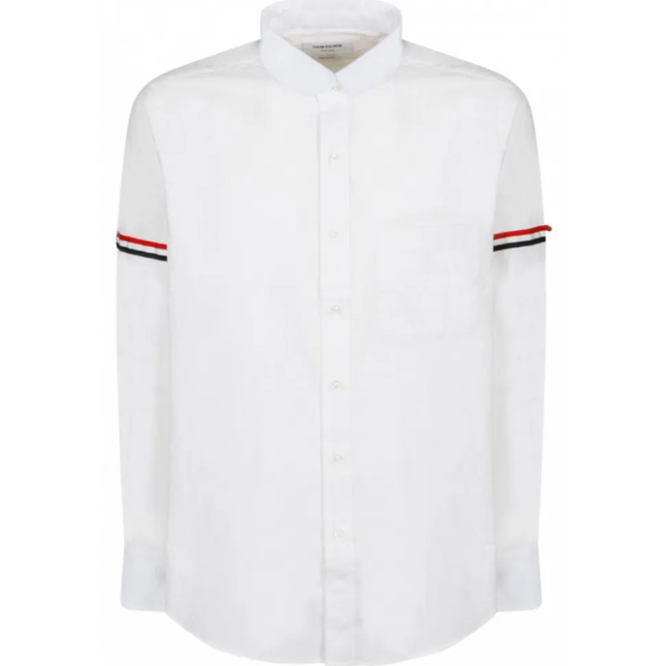 Thom Browne White Arman Detail Shirt. White cotton shirt, front button closure, single patch pocket, signature striped grosgrain loop tab. Pleated back yoke with locker loop, nametag applique above hem, grosgrain armbands.