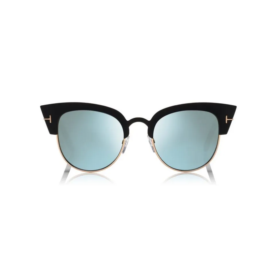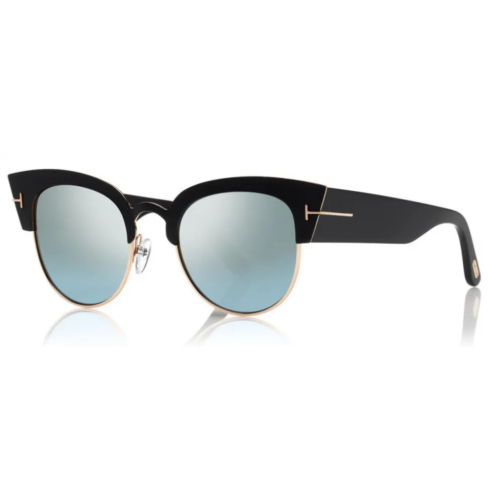 Matte black metal front and shiny black acetate temple with shiny rose gold metal rims and T logo with gradient blue flash lenses.