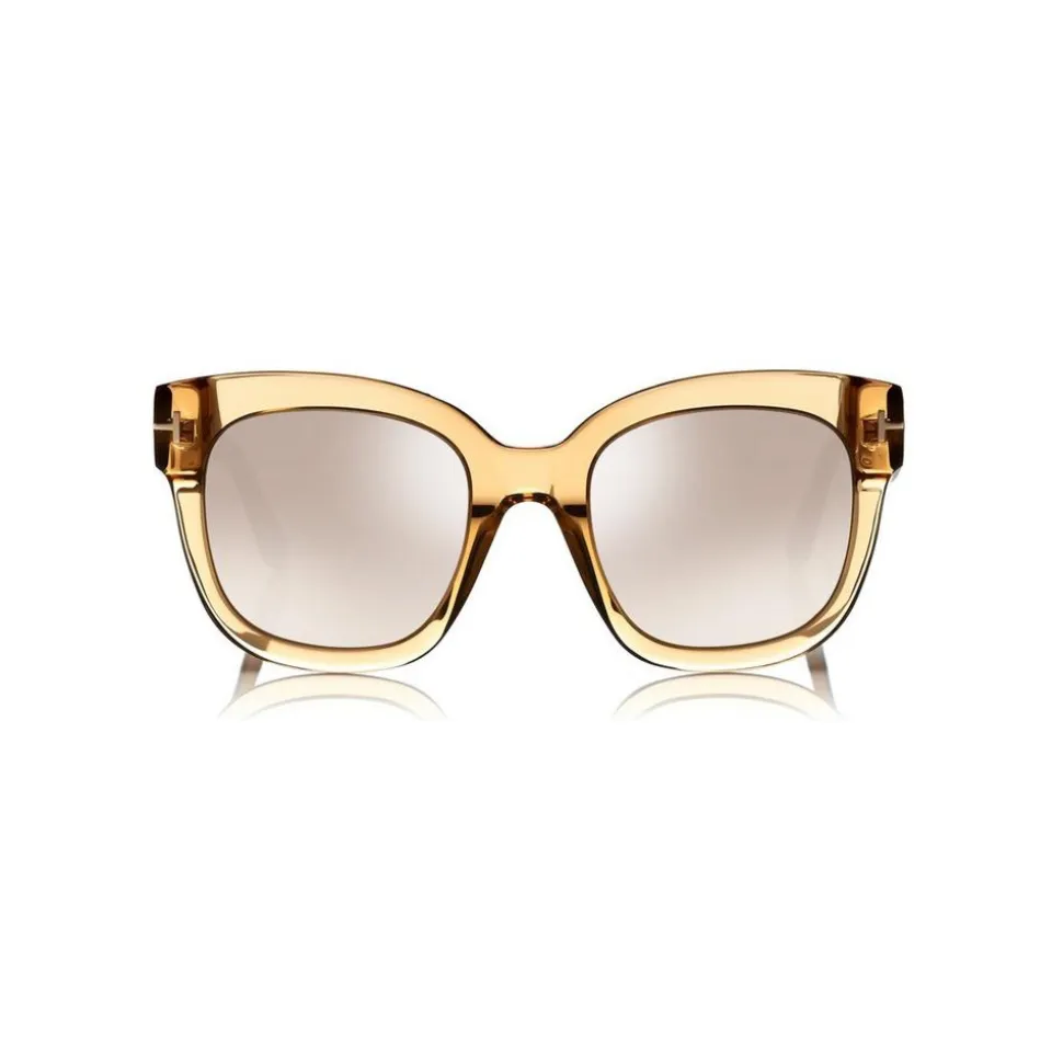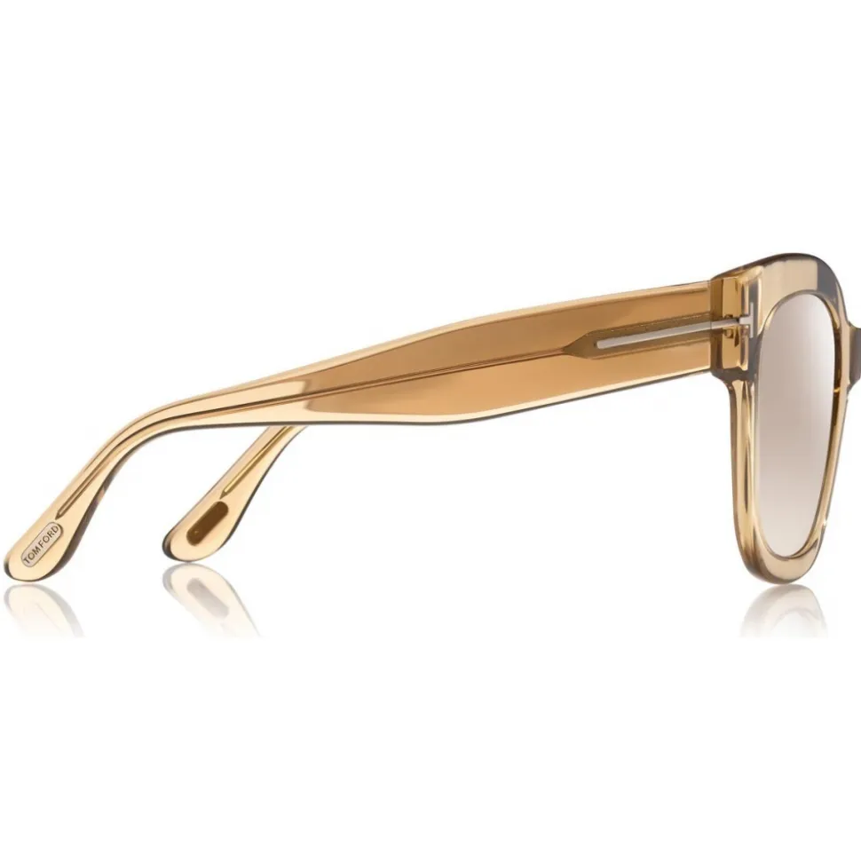 Shiny transparent champagne acetate style with shiny rose gold T logo decoration with brown flash lenses.