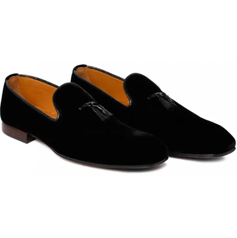 Tom Ford Black Bailey Loafers. Black velvet loafers, leather trim, tassel detail, square toe. Slip on style, branded leather insole, stacked heel, rubber sole.