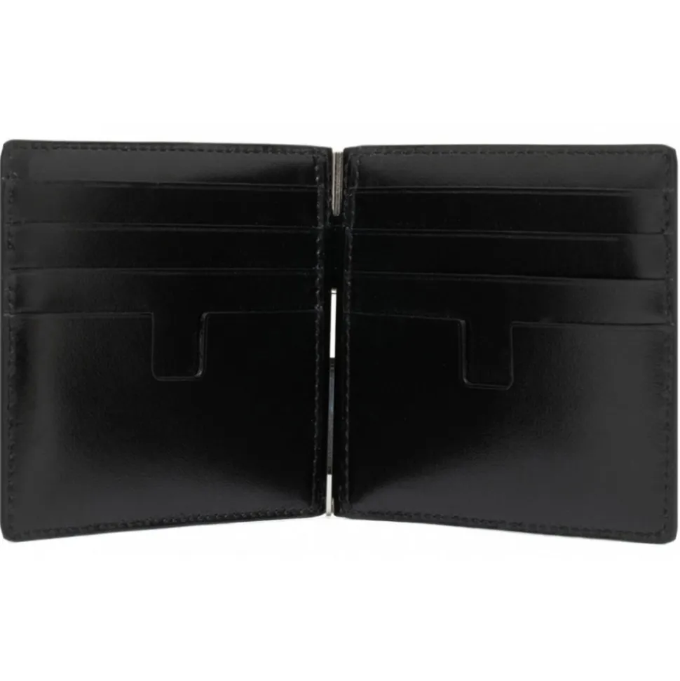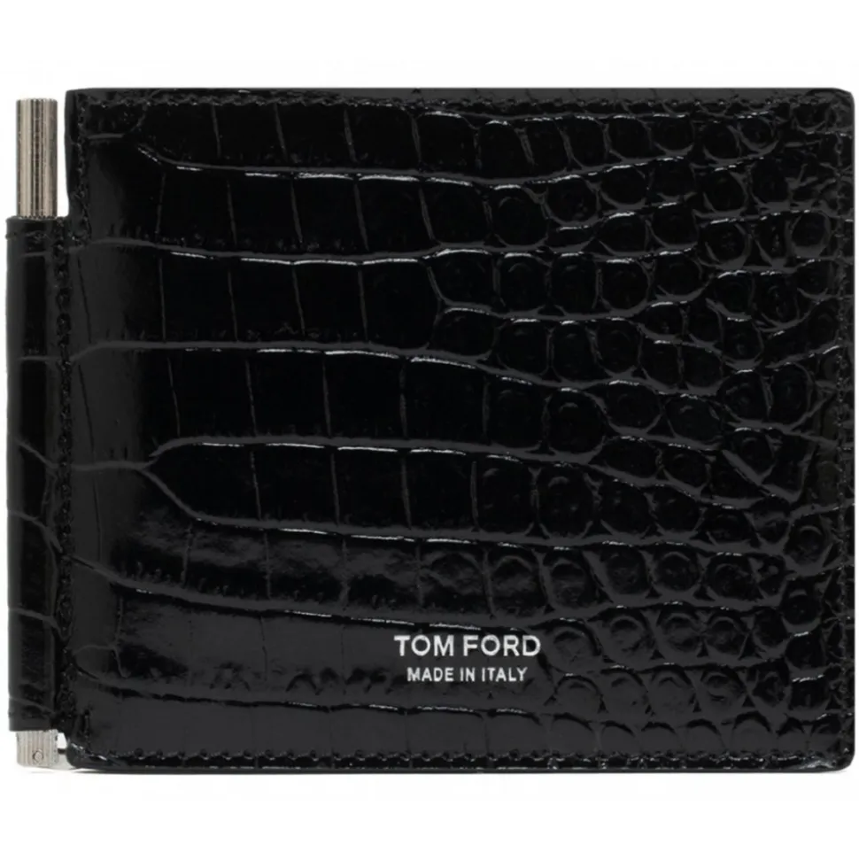 Tom Ford Black Calf Leather in Cocco Print Effect, printed logo in silver, 2 card slots and silver money clip on the back.