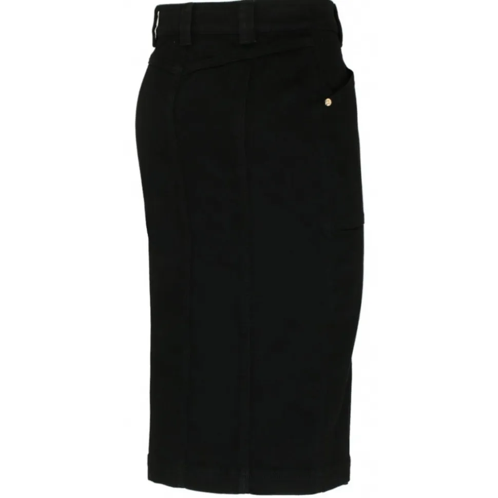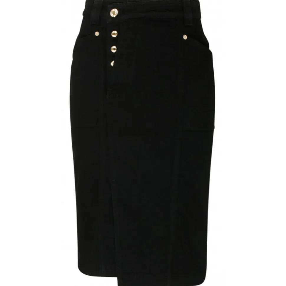 Tom Ford Black Cotton Blend Asymmetric Pencil Skirt. Black cotton blend pencil skirt, asymmetric front button fastening, asymmetric design, belt loops, embossed gold tone button, pencil silhouette.