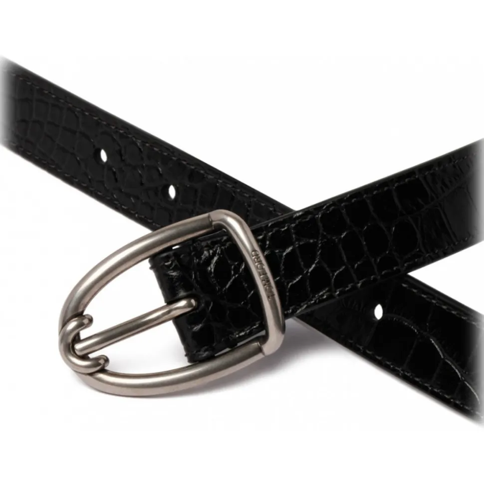 Tom Ford Black Logo Engraved Belt. Black calf leather belt, embossed crocodile effect. Logo engraved buckle, punched holes, adjustable fit.