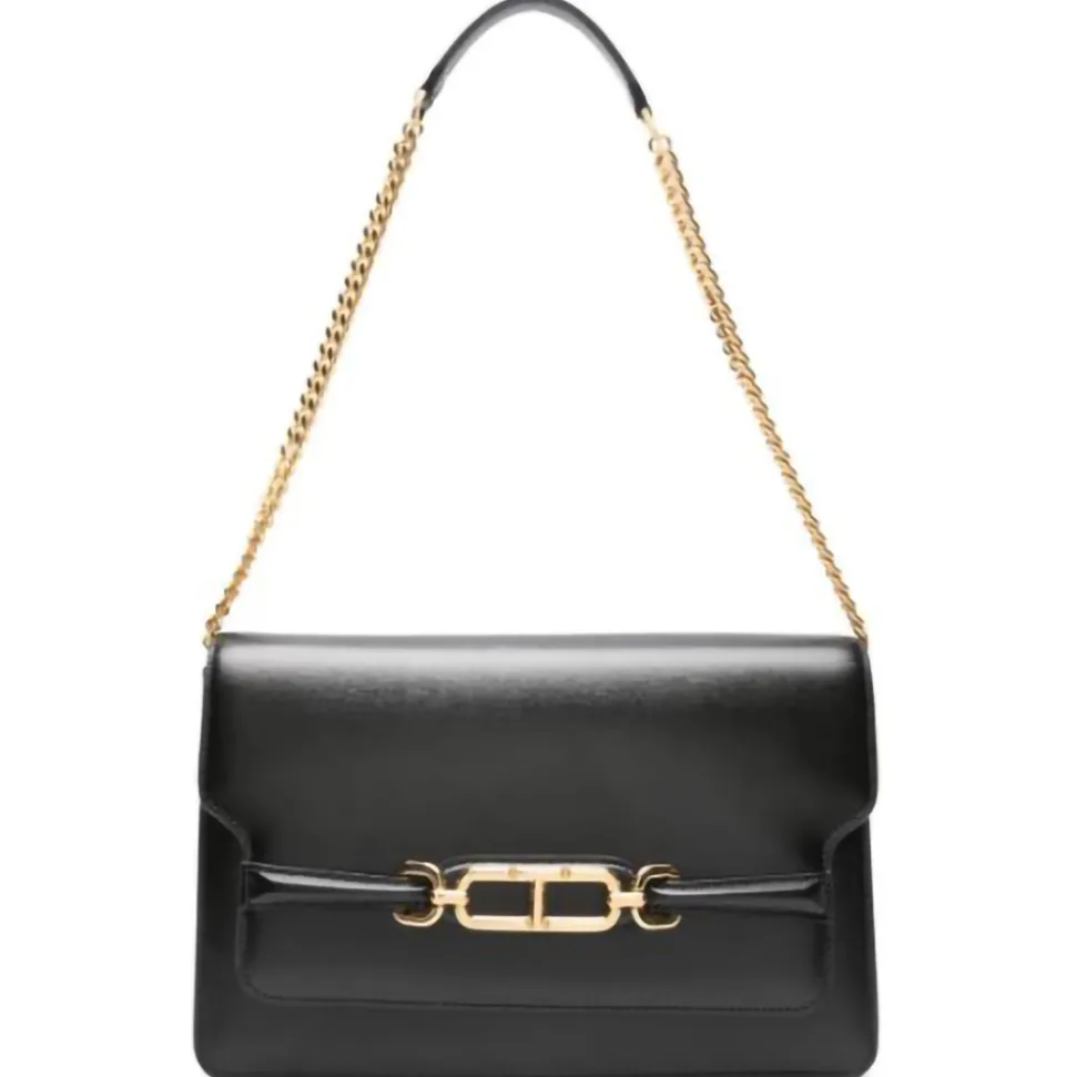 Tom Ford Black Medium Whitney Shoulder Bag. Black calf leather shoulder bag, gold tone logo plaque, foldover top with magnetic fastening. Leather and chain link shoulder strap, slip pocket to the front. Main compartment, internal logo stamp, internal slip pocket, leather lining, gold tone hardware.