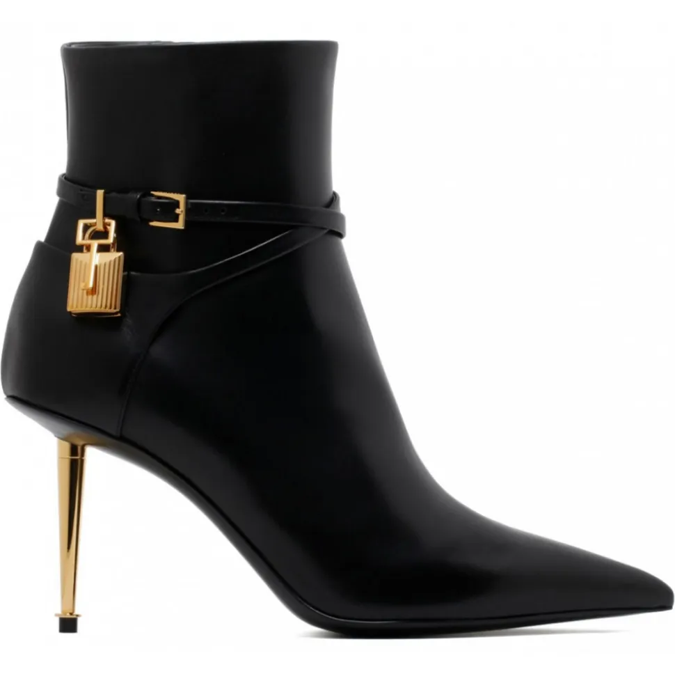 Tom Ford Black Leather 80mm Pointed Toe Boots. Black leather boots, padlock detail, side zip fastening, pointed toe, branded insole, 80mm high heel.