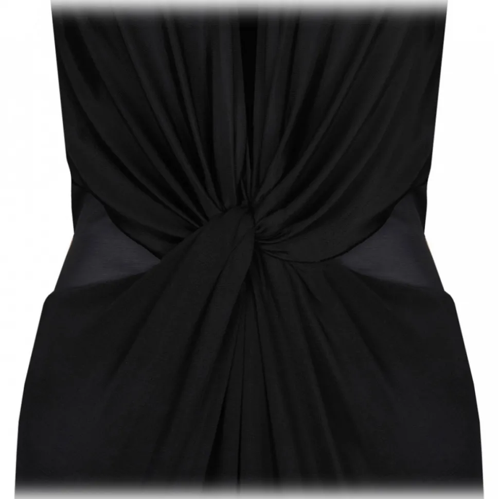 Tom Ford Black Sheer Maxi Dress. Black texture finish maxi dress, halterneck, knot detailing. Semi sheer panels, open back, long length, straight hem, rear hook and eye fastening.