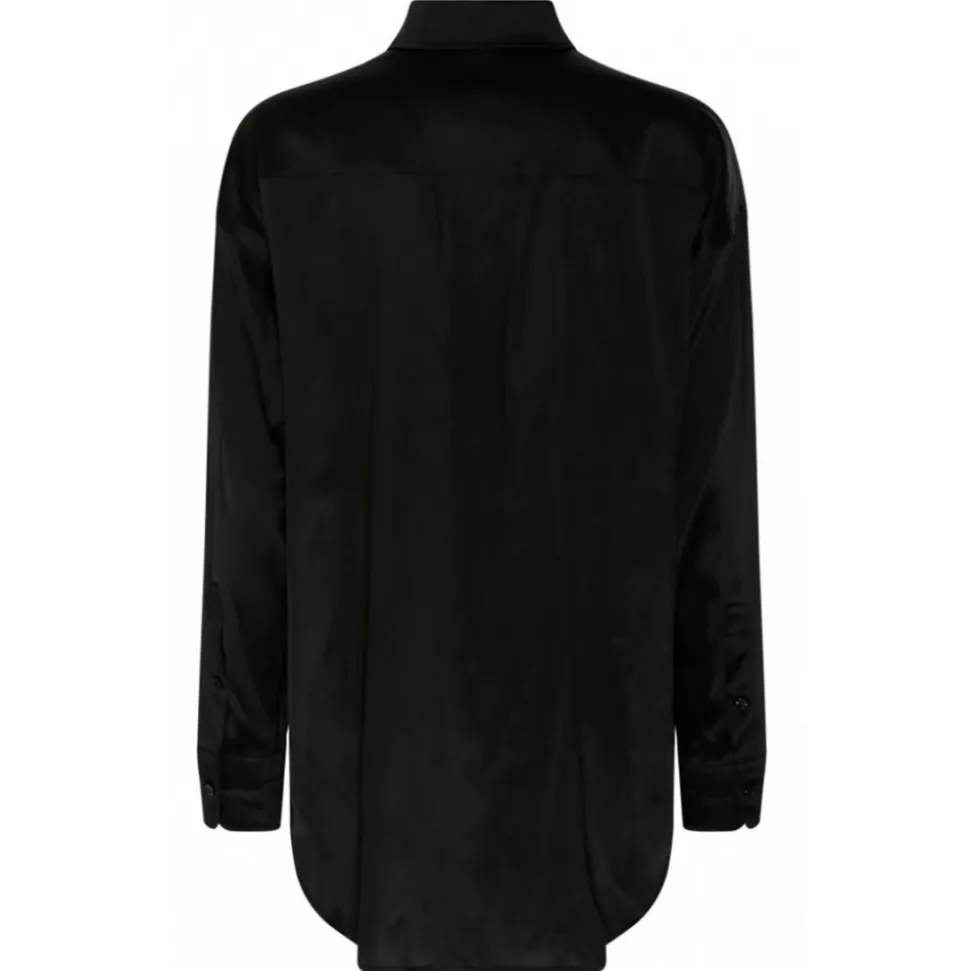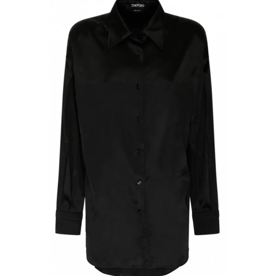 Tom Ford Black Silk Pointed Collar Shirt. Black silk shirt, straight point collar, front button fastening. Buttoned cuffs, long sleeves and straight hem.